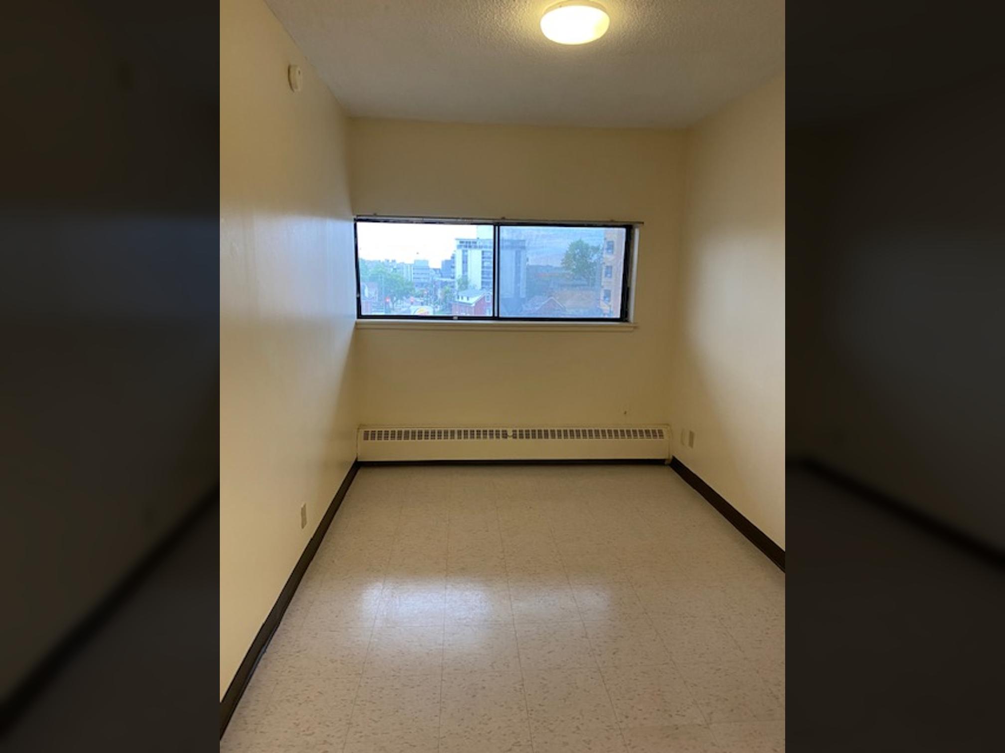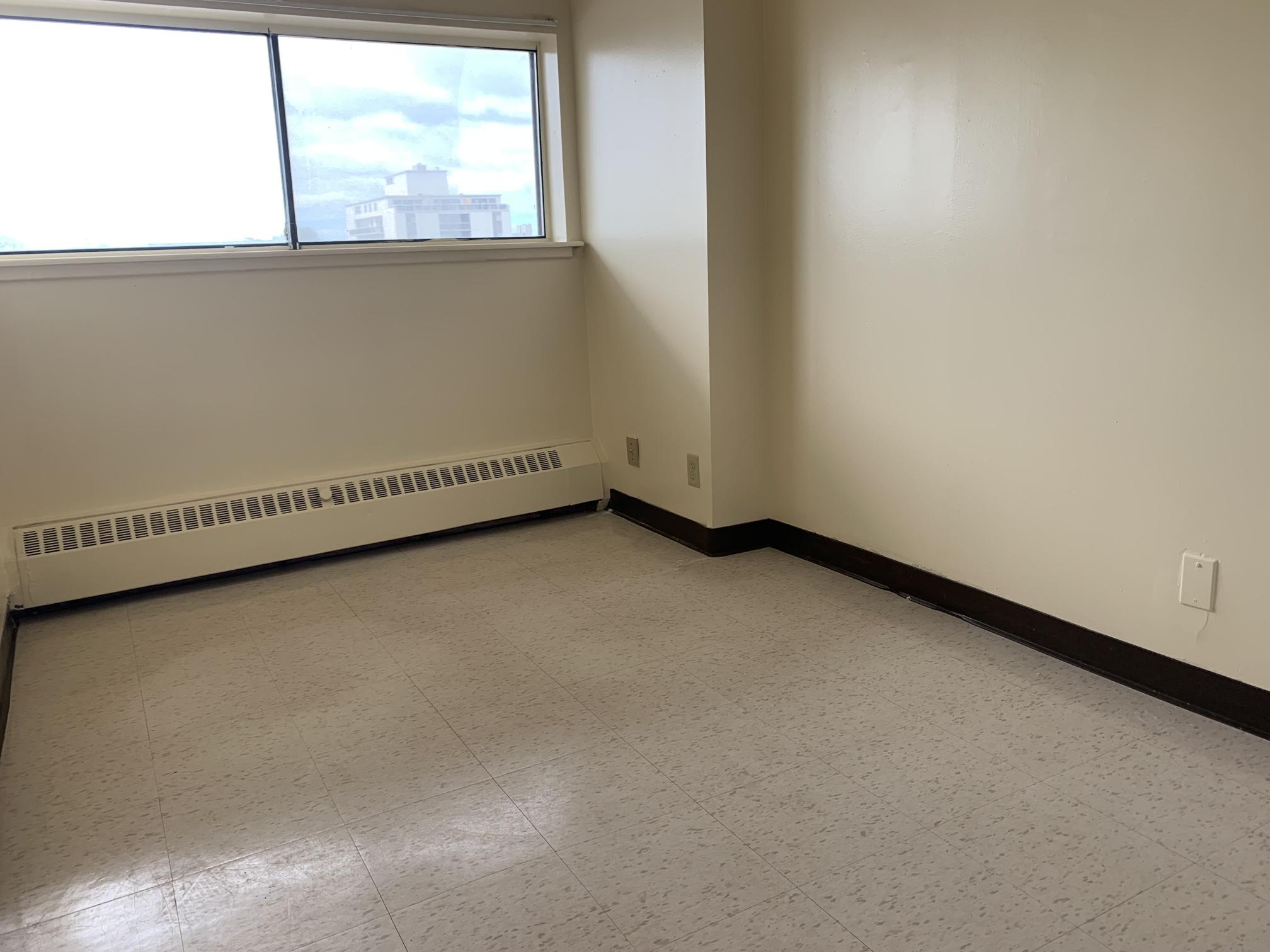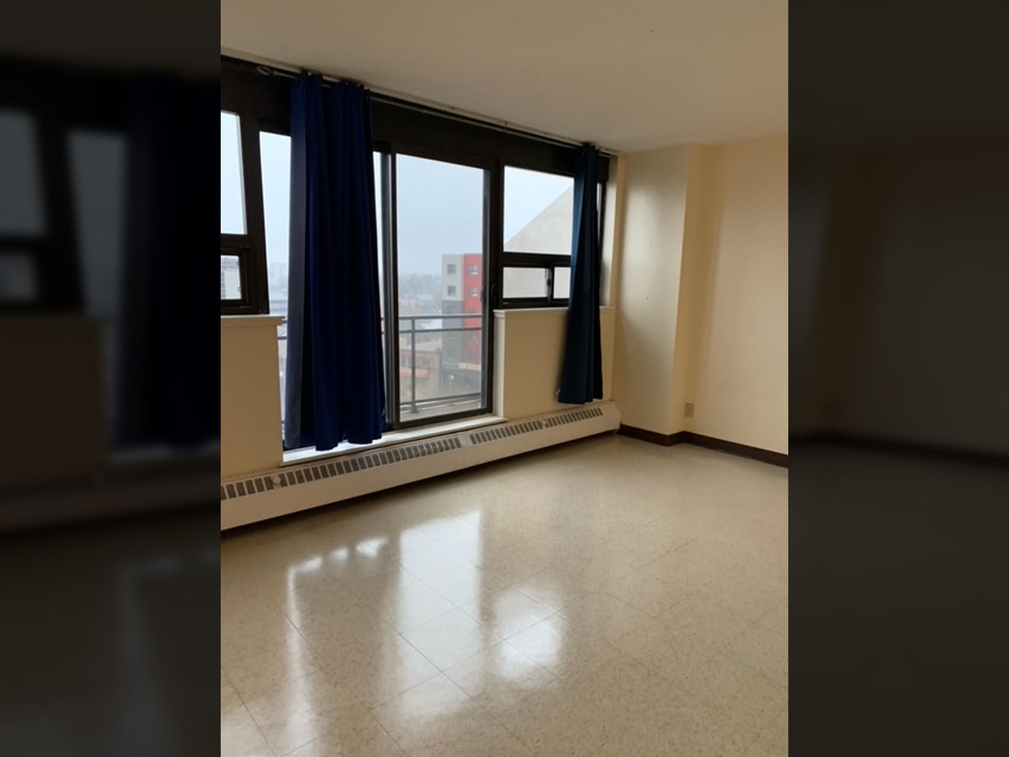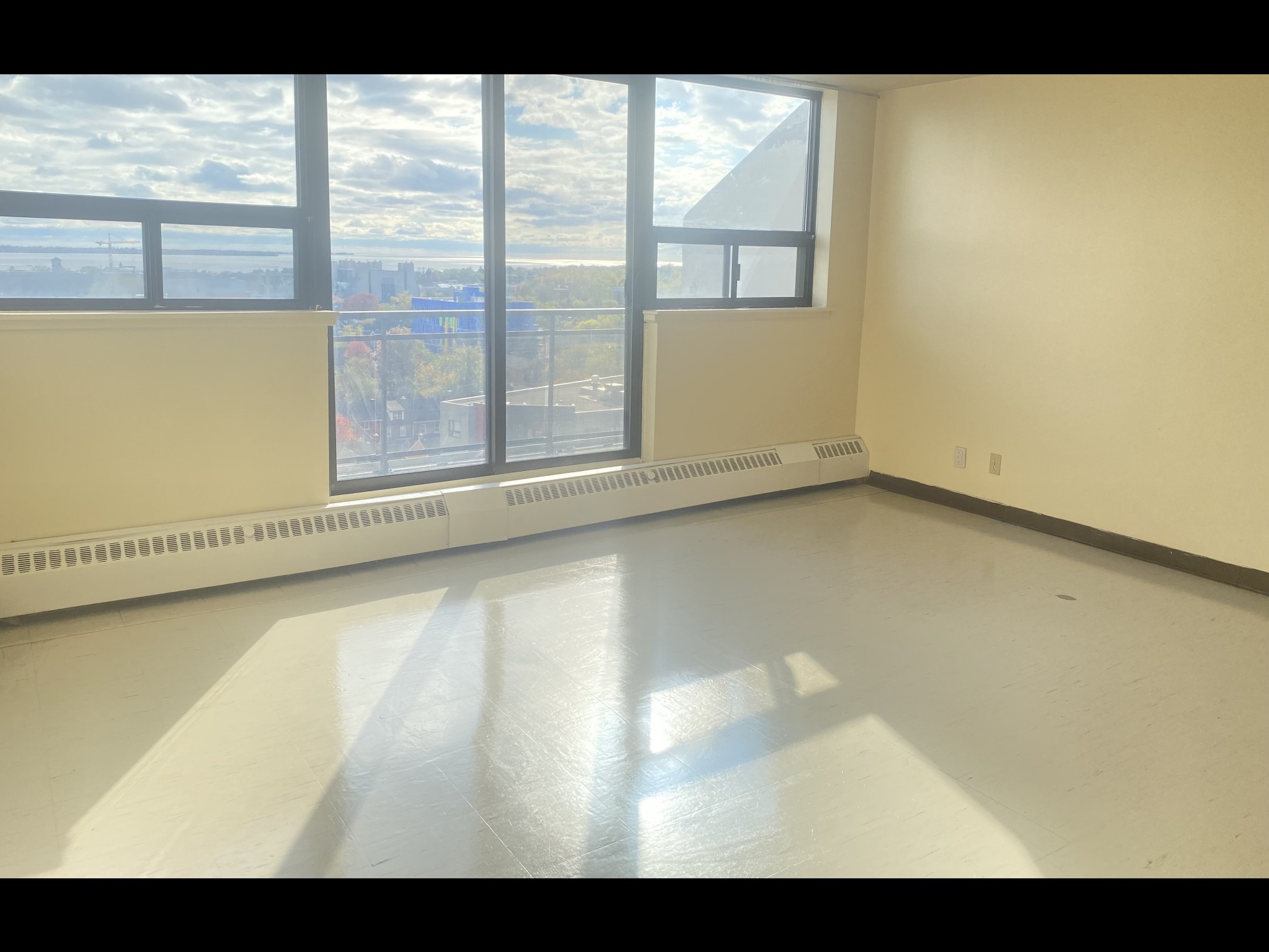 2 bedroom split level apartment with private balcony overlooking Princess Street and a smaller bedroom. The 12th floor provides a great view of Lake Ontario Queens University & Princess Street.